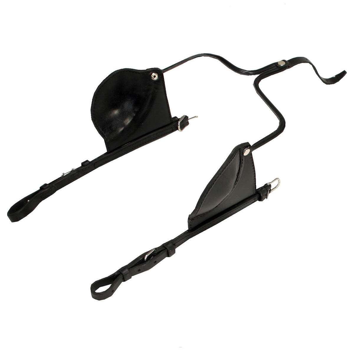 Закрытые блиндера (closed blinders) из высококачественной натуральной кожи. Наглазники имеют необычную полукруглую (half-round) выпуклую наружу форму, которая повторяет анатомическое строение глаза. Блиндера, полностью ограничивая заднее и боковое зрение, не доставляют лошади неудобства, т.к. все детали повторяют каждое движение головой и плотно к ней прилегают. Фурнитура сделана из нержавеющей стали.