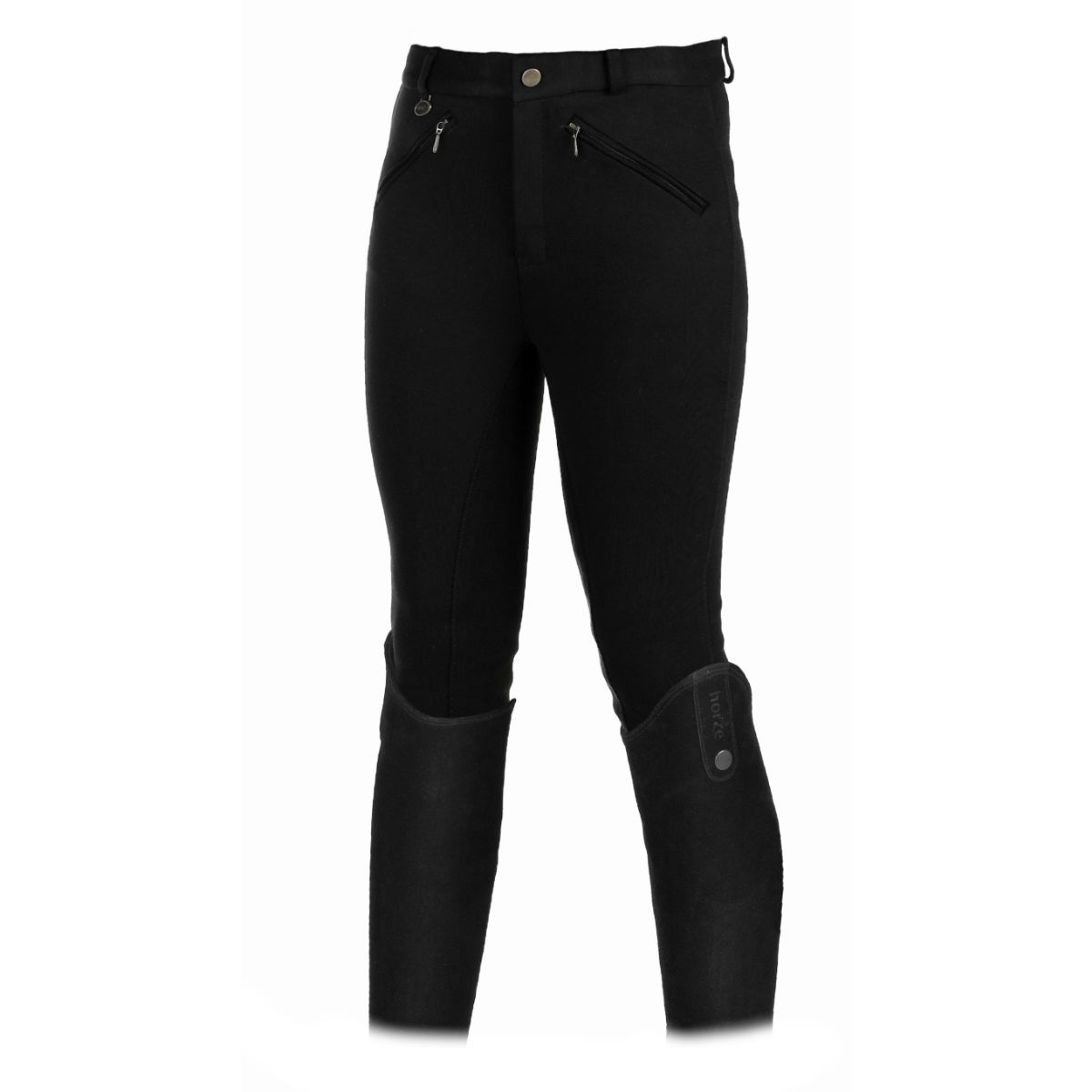 Хлопчатобумажные трикотажные детские бриджи (Breeches) с полной леей из искусственной замши. Талия средней высоты хорошо закрывает поясницу. Передние карманы на молнии. Низ брючин застегивается на липучку. Все металлические детали медного цвета.
