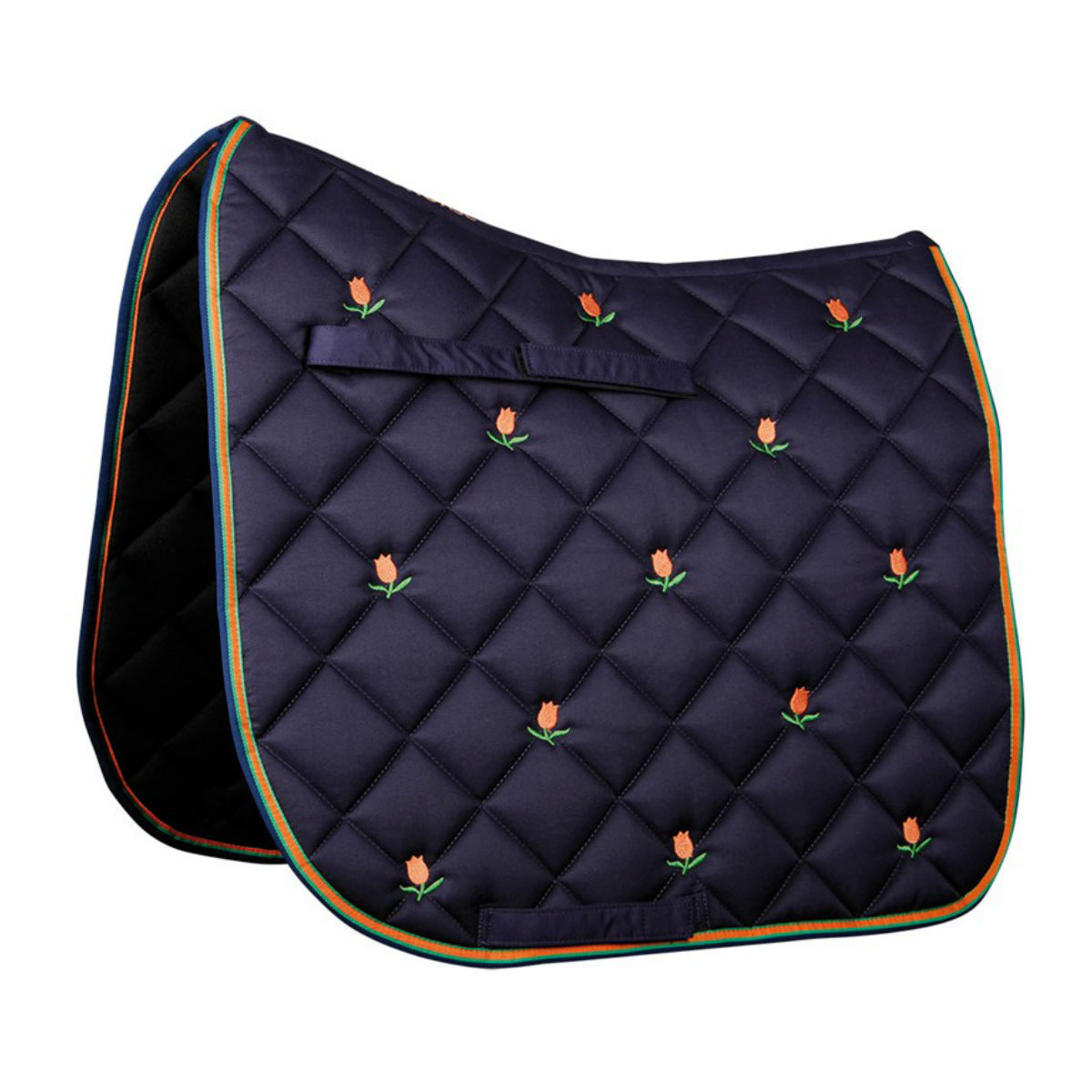 Универсальный вальтрап (All-Purpose Saddle Pad) анатомической формы. Наполнитель из поролона и синтепона делает вальтрап объемным, что очень важно для амортизации. Ромбовидная стёжка. С обеих сторон украшен вышивкой в виде тюльпанов и двухцветным декоративным кантом. Вальтрап хорошо держит форму и легок в уходе. Крепится на липучки.