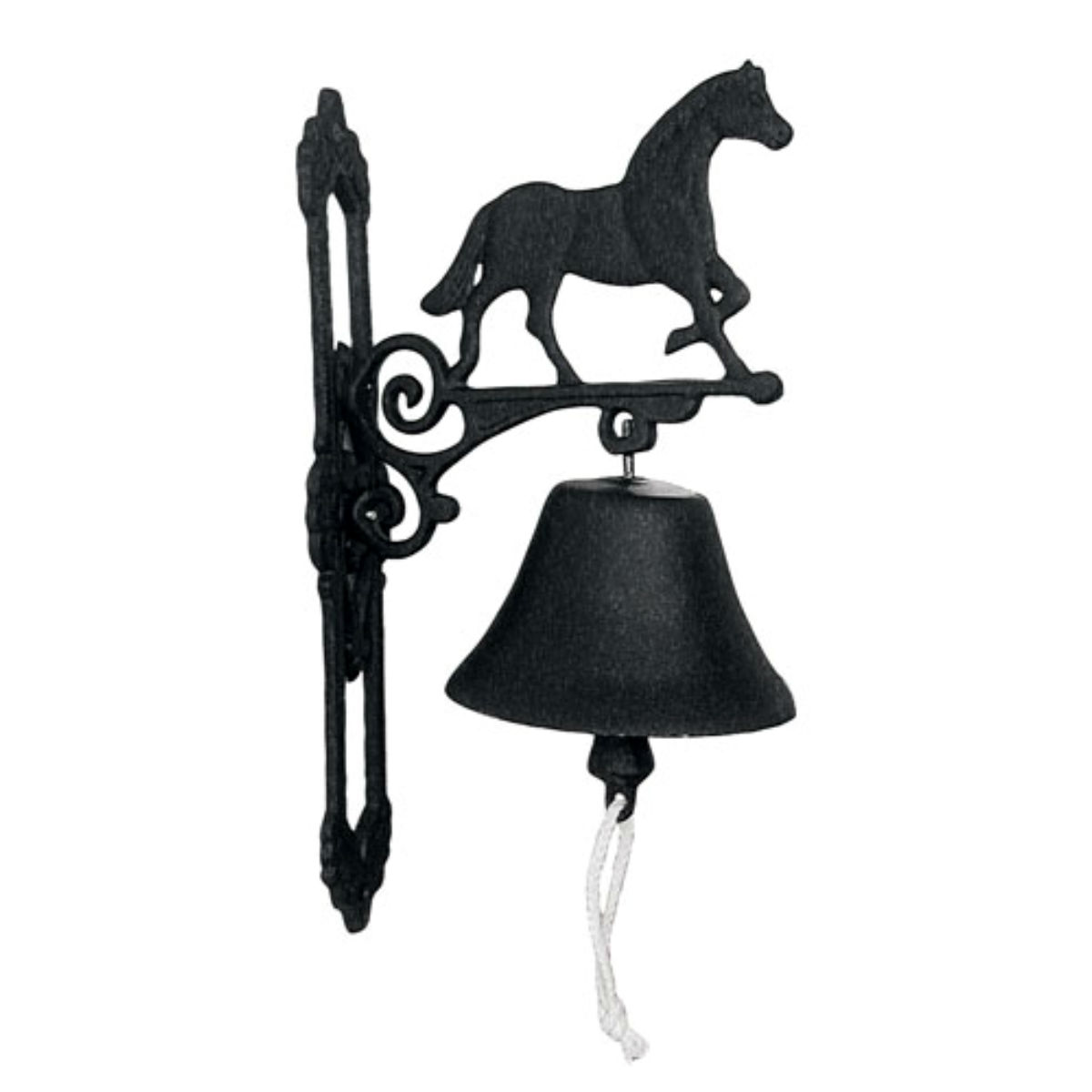 Такой дверной колокольчик станет прекрасным украшением загородного дома, дачи или прекрасным подарком. Фигурное литье кронштейна и простая форма колокольчика дополнены рельефным изображением лошади.