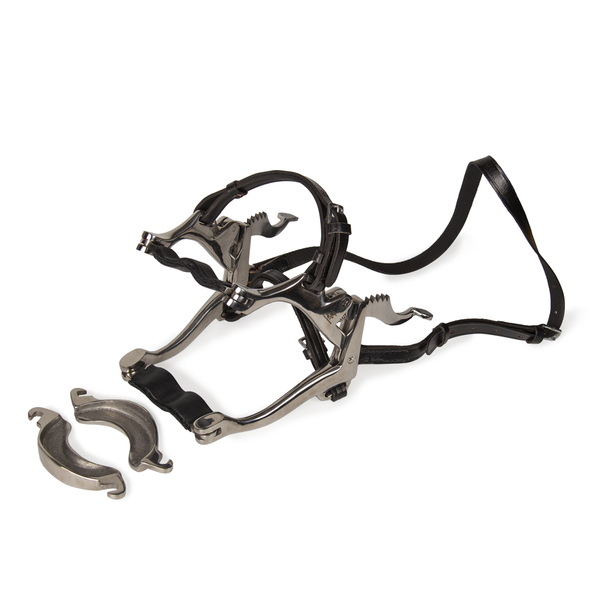 В комплекте прикусные пластины, предназначенные для безопасной работы с резцами. Производящий осмотр становится на стул, или на конюшенное ведро, чтобы удобнее исследовать рот животного и вкладывает зевник сначала горизонтально, а потом, поворачивая, ставит его в вертикальном положении между челюстями лошади, которые, таким образом, остаются открытыми.