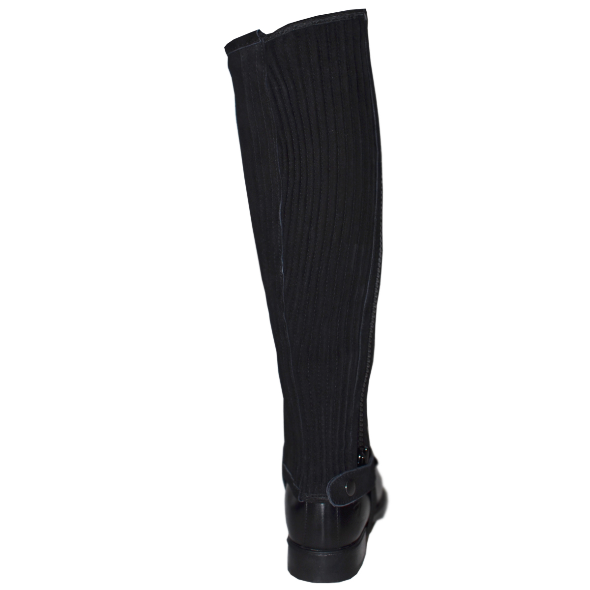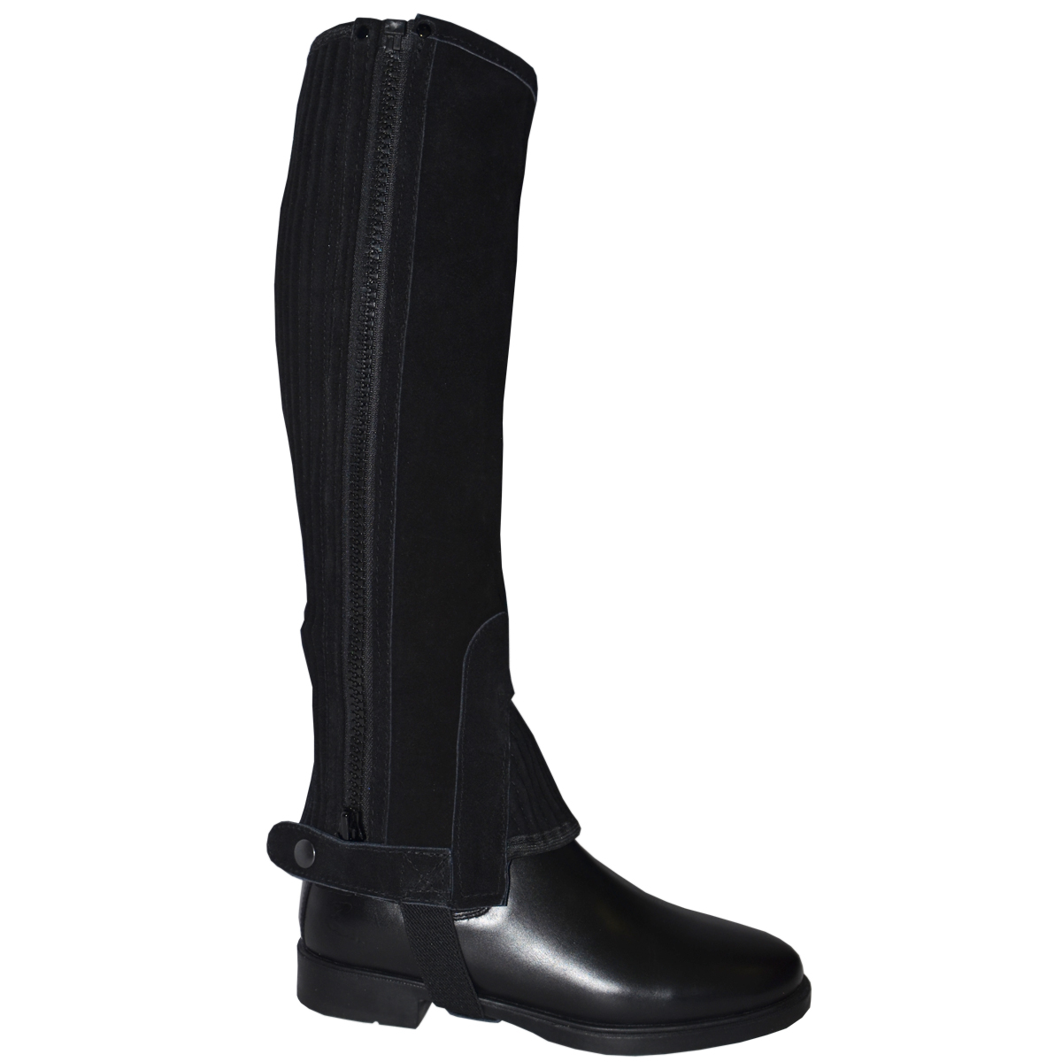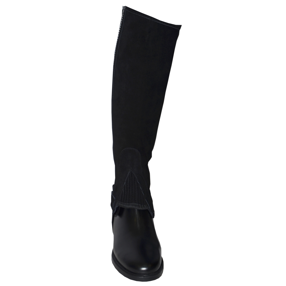Краги из натуральной замши. Имеется эластичная вставка по всей длине, что обеспечивает плотное прилегание краги к ноге. В нижней части присутствует защитный язычок. Все края обшиты тесьмяной полосой, что придает более привлекательный вид и позволяет дольше сохранить форму. Дополнительное усиление в области резинки.