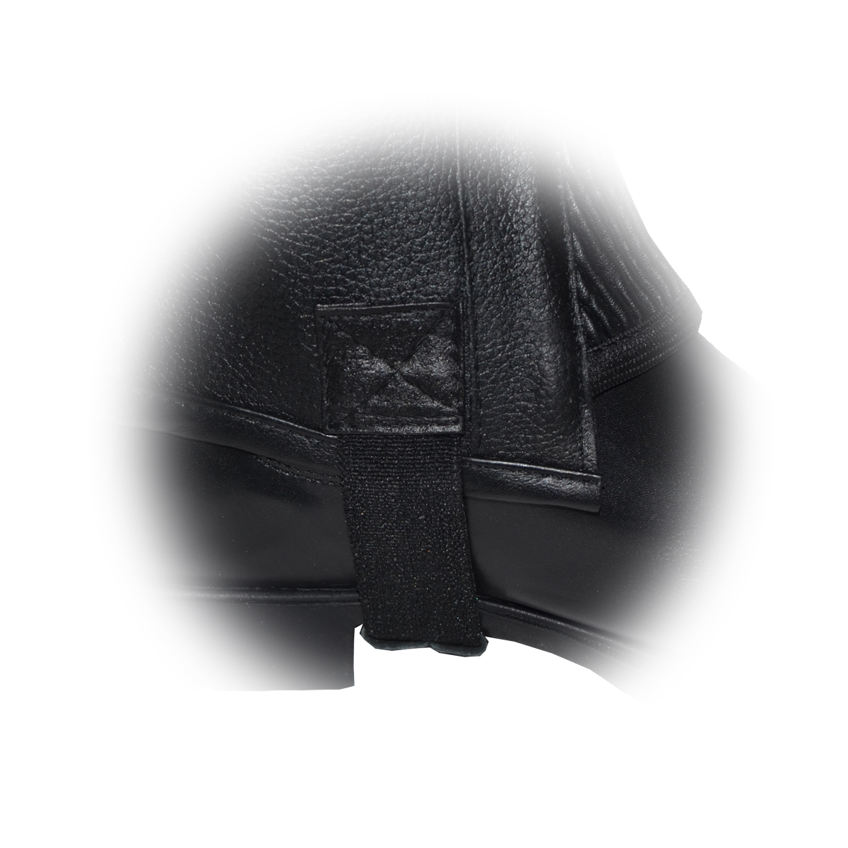 Краги из натуральной кожи. Имеется эластичная вставка по всей длине, что обеспечивает плотное прилегание краги к ноге. Верхняя застежка на липучке, в нижней части присутствует защитный язычок. Все края обшиты тесьмяной полосой, что придает более привлекательный вид и позволяет дольше сохранить форму. Дополнительное усиление в области резинки.