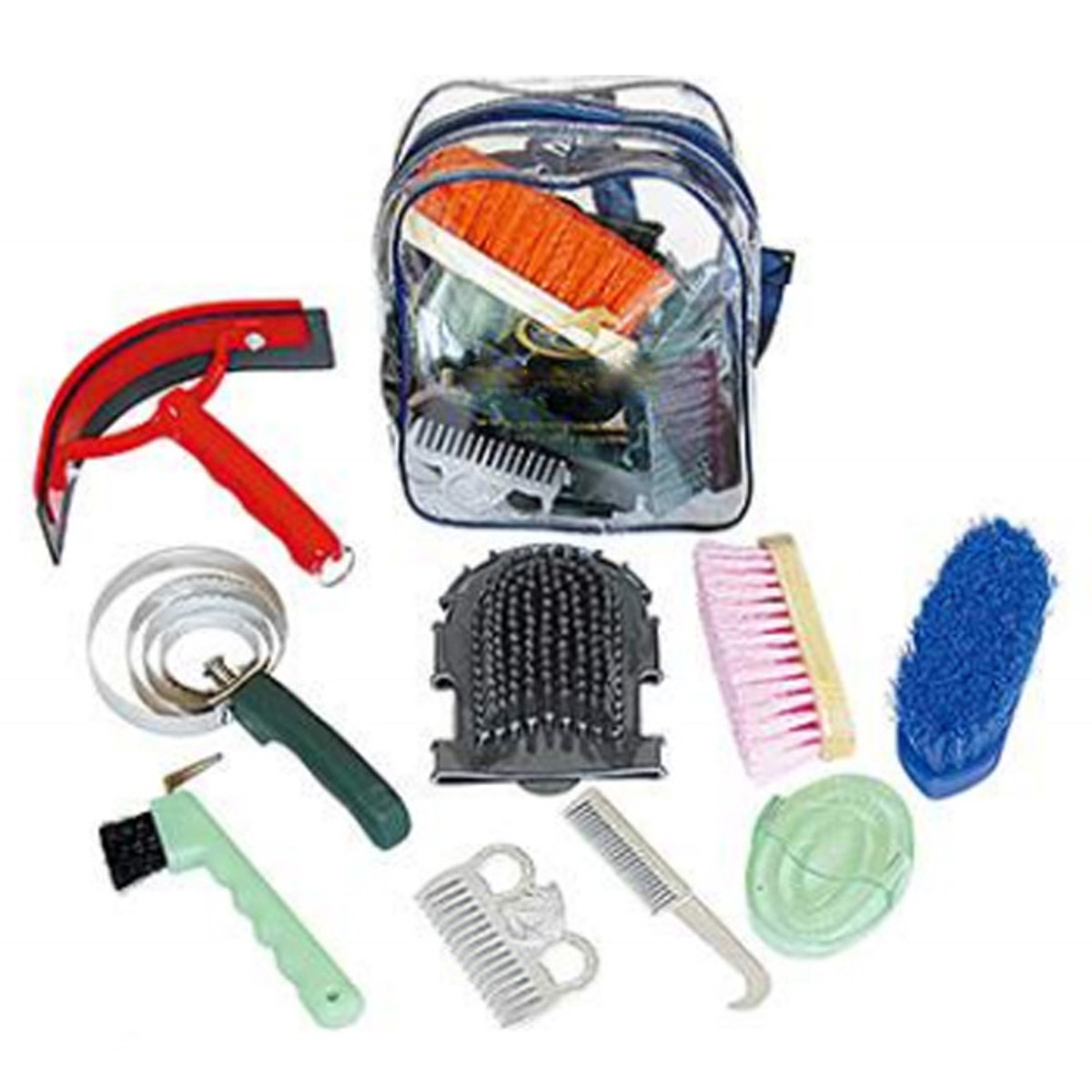 Набор щеток из девяти предметов: водосгонка пластиковая, перчатка-щетка, расческа алюминиевая с крючком, гребешок алюминиевый, скребница металлическая, скребница резиновая, крюк копытный, щетка-сметка маленькая, щетка с искусственной щетиной. Щетки на деревянной основе. Набор поставляется в прозрачном рюкзачке. Рюкзачок затягивается на молнию.