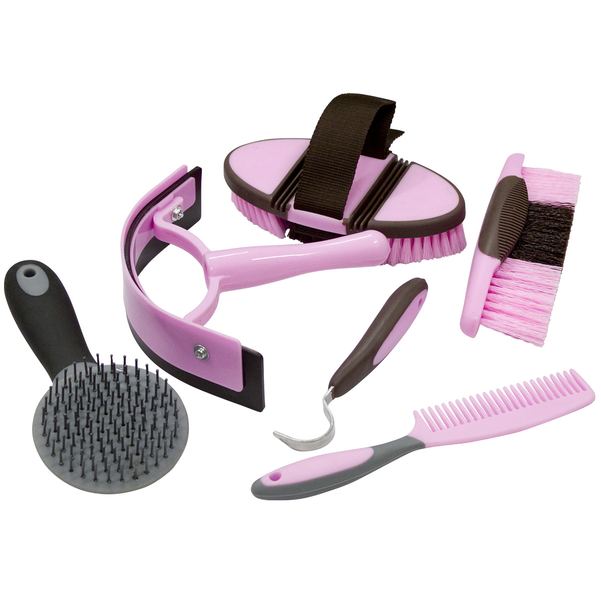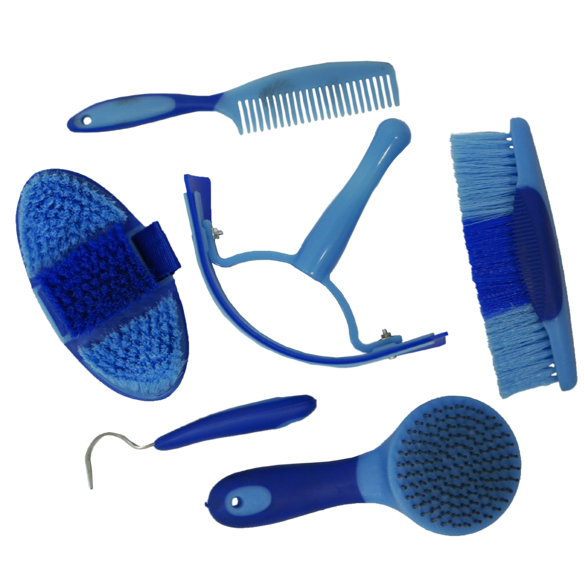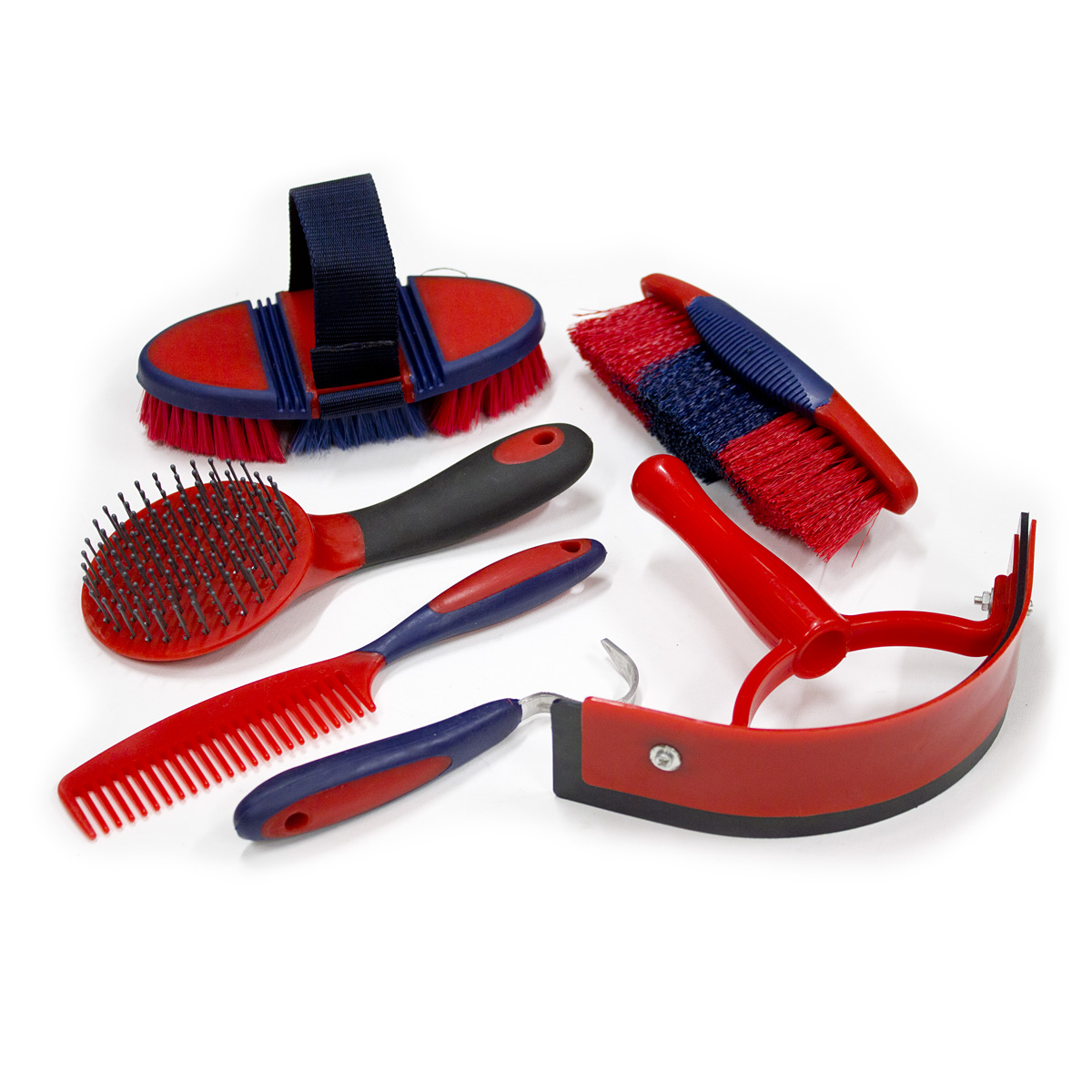 Набор щеток в мягкой сумке (bag with brushes for cleaning horses). В набор входит пластиковая расческа с удобной объемной ручкой, мягкая щетка на гибкой основе, водосгонка, копытный крюк, щетка жесткая и расческа массажер. Продаются в комплекте с удобной объемной тряпичной сумкой с длинным плечевым ремнем и короткими ручками. Верх сумки застегивается на молнию. Снаружи шесть открытых карманов. Для устойчивости на дне сумки пластиковые ножки.