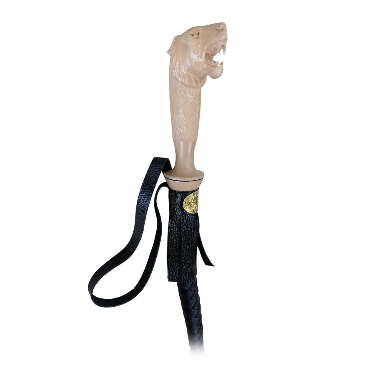 Ручная работа. Нагайка изготовлена из натуральной кожи (юфть) с применением четырехосного плетения. Деревянная ручка из ольхи выполнена в виде изображения зверей, при изготовлении применен стиль богородской резьбы.
