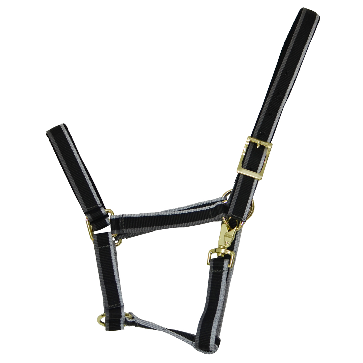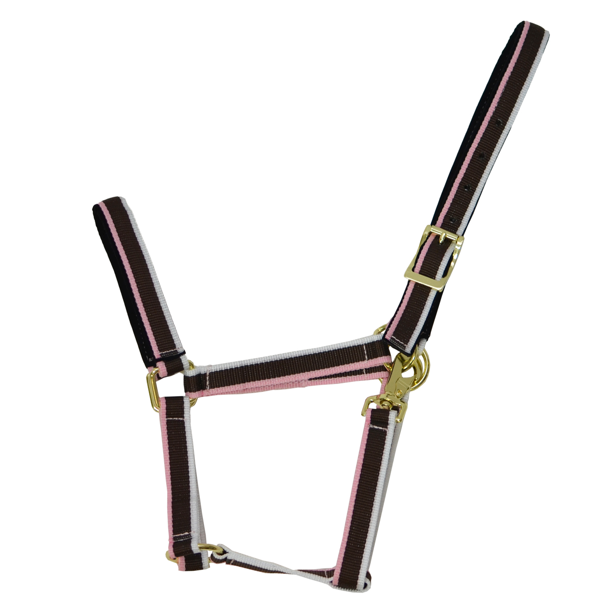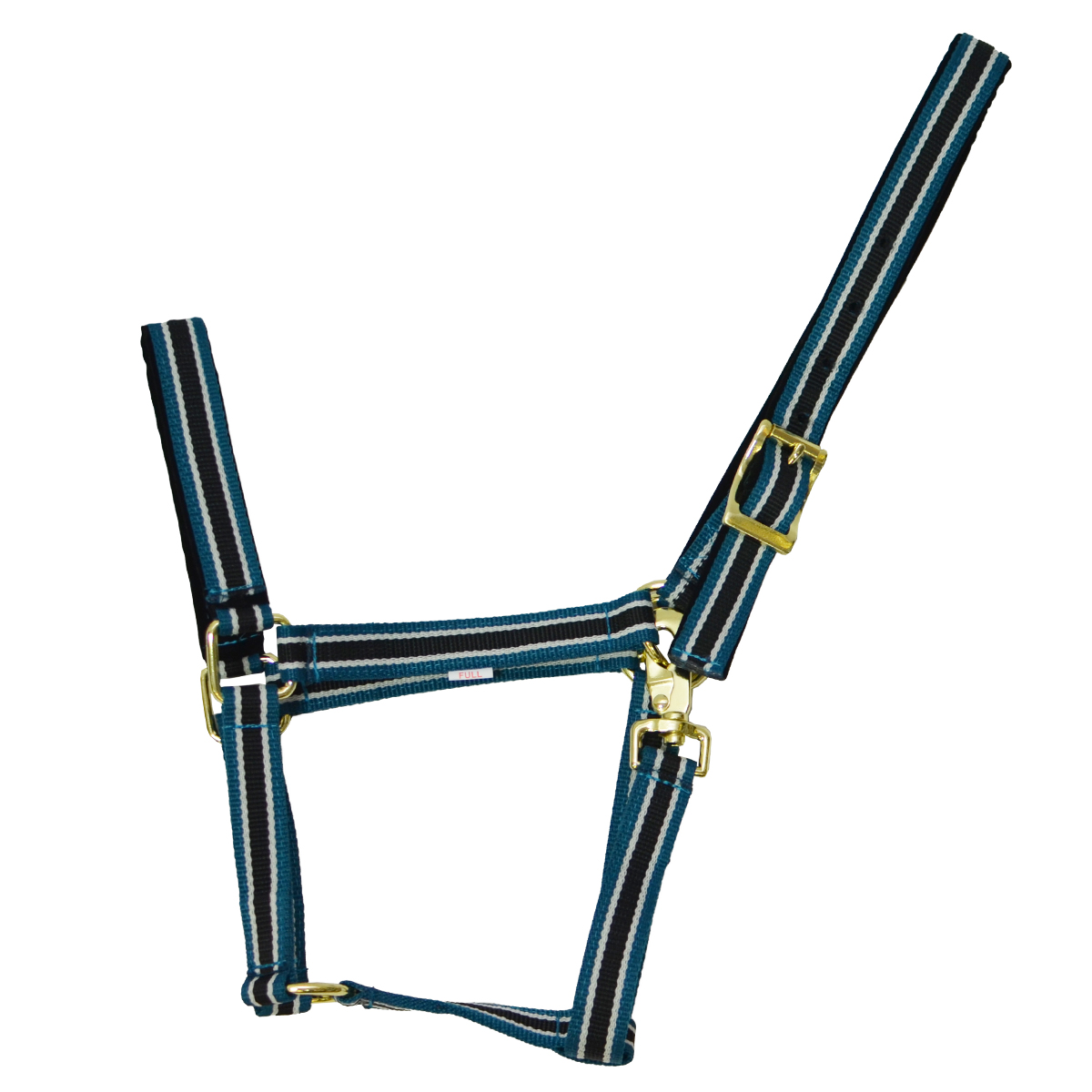 Прочный нейлоновый недоуздок (Halter) в полоску. Затылочный и носовой ремни имеют бархатную подложку, что предотвращает натирание. Затылочный ремень регулируется, что обеспечивает идеальную посадку на голове лошади. Недоуздок легко снимается и одевается благодаря карабину. Фурнитура золотистого цвета.