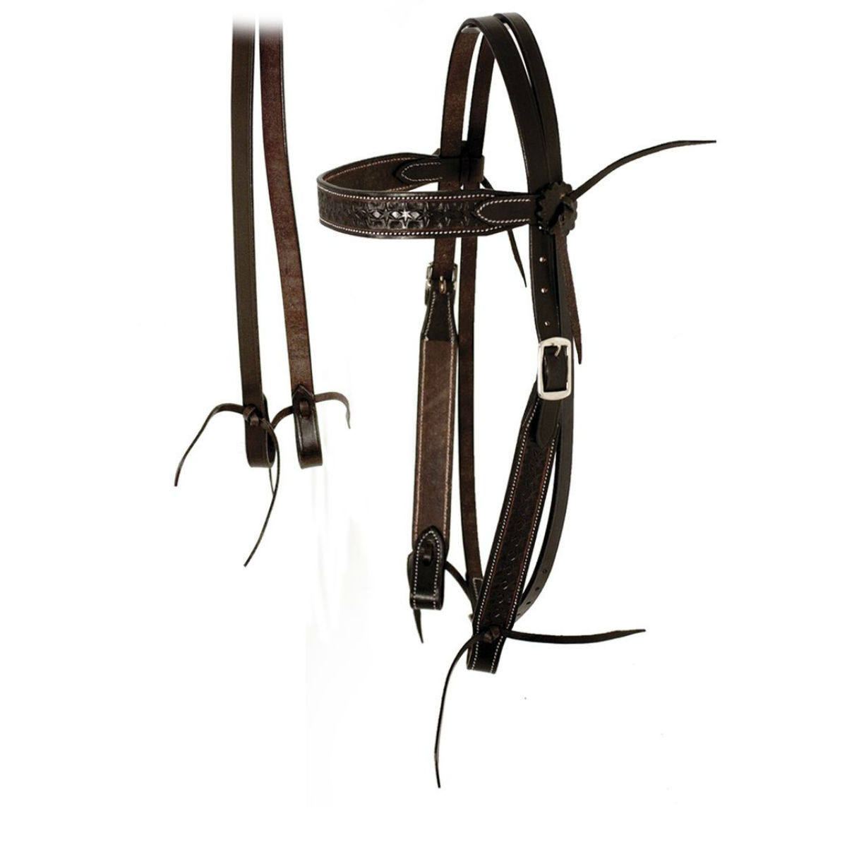 Оголовье вестерн из кожи высокого качества. Выбитый рисунок и контрастная отстрочка украшают налобный и нащечный ремни. В комплект входит кожаный повод. С регулируемым нащечным ремнем с двух сторон. Фурнитура серебристого цвета из нержавеющей стали. Трензель в комплект не входит.