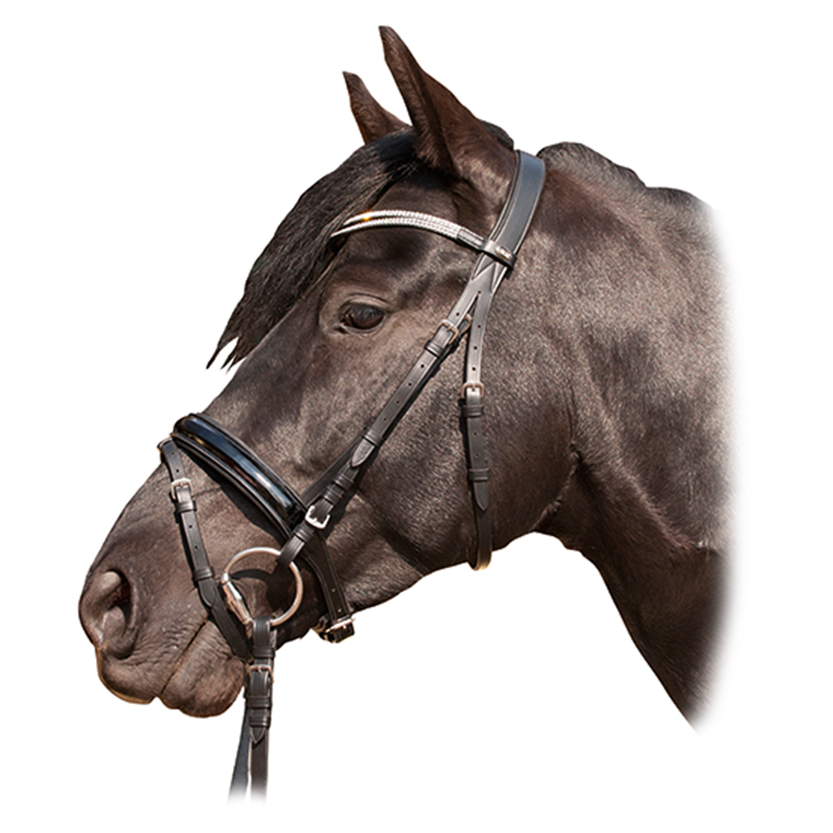 Оголовье из качественной кожи (Leather Bridle) с английским капсюлем из лакированной кожи. Мягкая подложка на капсюле и затылочном ремне делает уздечку комфортной даже для чувствительных лошадей. Налобник выполнен из россыпи синтетических страз, что будет стильно смотреться на Вашей лошадке. Фурнитура из нержавеющей стали серебристого цвета. В комплект входит тесьмяный повод с ограничителями. Без трензеля.