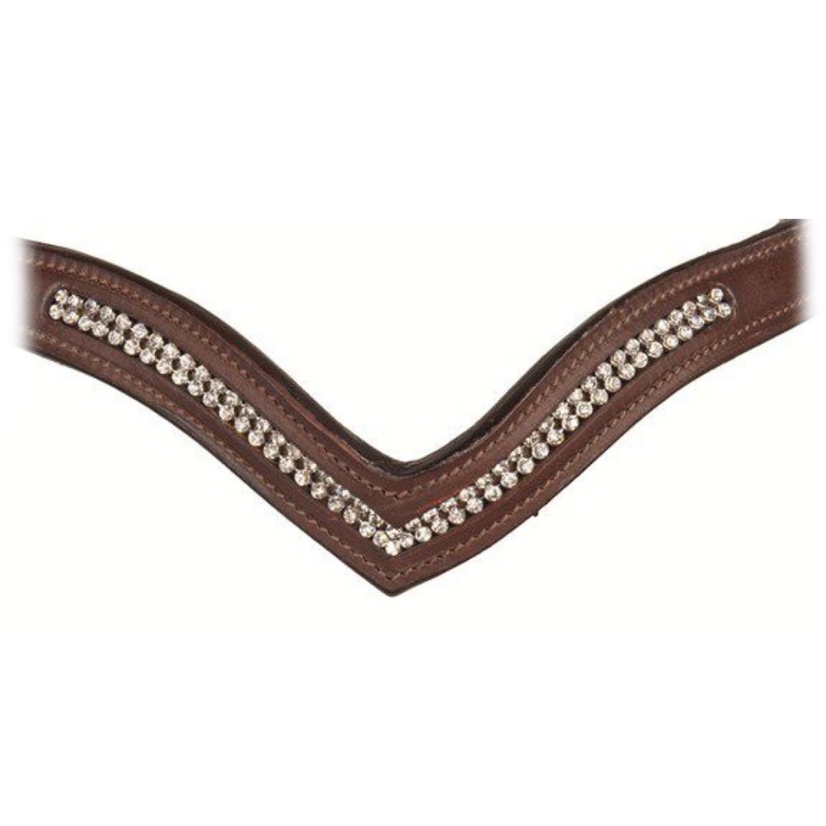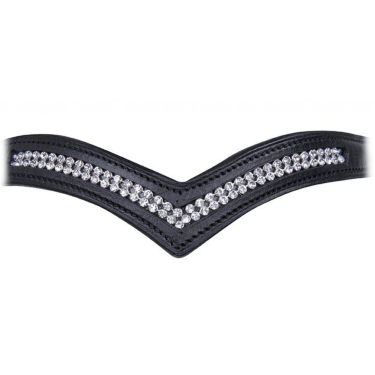 Элегантное трензельное оголовье из кожи высокого качества. Фурнитура серебристого цвета. Налобный ремень V-образной формы украшен россыпью страз. Повод тесьмяный с ограничителями в тон оголовья. Трензель в комплект не входит.