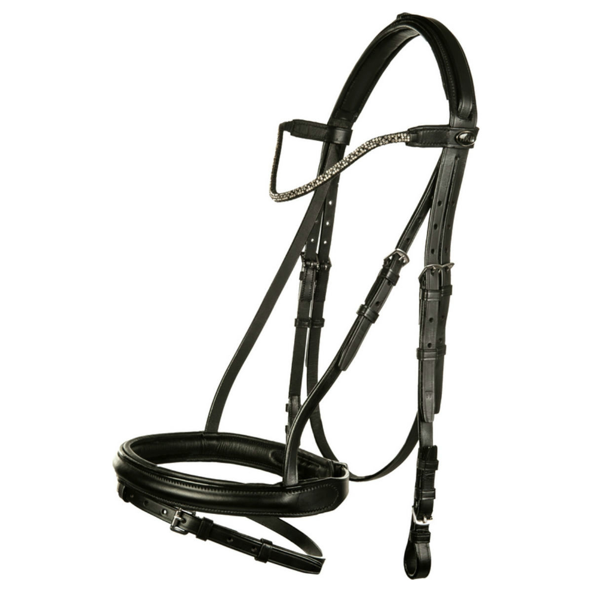 Трензельное оголовье из натуральной яловичной кожи (Leather Bridle) с английским капсюлем. Уздечка особенно комфортна благодаря мягким подложкам на капсюле и затылочном ремне, предотвращающие натирание деталями уздечки морды лошади. Ремень капсюля проходит поверх затылочного ремня. Тесьмяные поводья с нашивками против скольжения будут очень удобны для всадника. Оголовье смотрится очень красиво благодаря налобнику, украшенному стразами. Прочная фурнитура серебристого цвета.