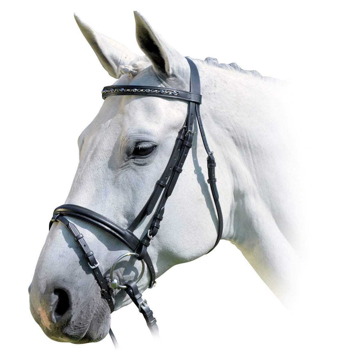 Трензельное кожаное оголовье с капсулем «восьмерка». Налобный ремень украшен металлической цепочкой с камешками голубого цвета. Повод тесьмяный. Фурнитура серебристого цвета. Трензель в комплект не входит.