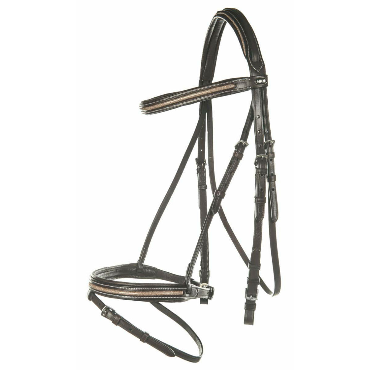 Оголовье трензельное из качественной натуральной кожи. Вдоль налобника, капсюля и затылочного ремня вставка с блестящим напылением золотистого цвета (для оголовья коричневого цвета) или вставка серебристого цвета (для оголовья черного цвета). Фурнитура серебристого цвета. Мягкая подложка на переносице и затылке. В комплект входит тесьмяный повод с ограничителями. Трензель в комплект не входит.