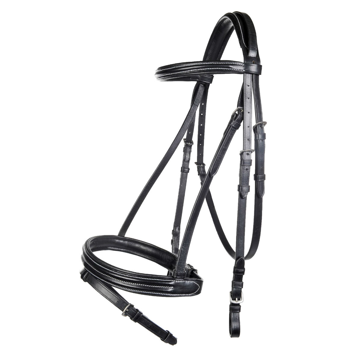 Очень мягкое оголовье из яловичной кожи с декоративной белой вышивкой (Leather Bridle). Ремень английского капсюля проходит над затылочным ремнем. Прочные серебристые пряжки. Подкладка на переносице, затылке и налобнике сделана из особо мягкой кожи, что обеспечивает максимальный комфорт вашей лошади. В комплект входит тесьмяный повод с ограничителями и нашивкам против скольжения.