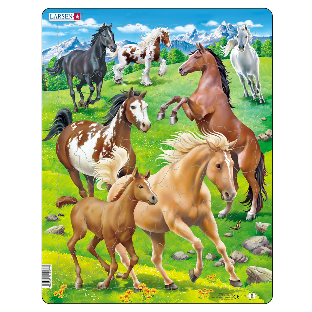 Яркий красочный пазл (Larsen Puzzle) с лошадками порадует ребёнка и станет отличным подарком. Каждый пазл имеет собственную подложку. Детали разных форм и размеров помогают ребенку развивать мелкую моторику.