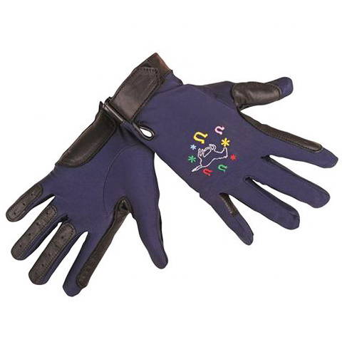 Детские перчатки (riding gloves) для верховой езды из эластичного дышащего материала с цветной вышивкой. Перчатки усилены на лодонях и пальцах вставками из натуральной кожи, что препятствует выскальзыванию повода. Застегиваются на запястье при помощи липучки, манжет перчаток также выполнен из натуральной кожи.