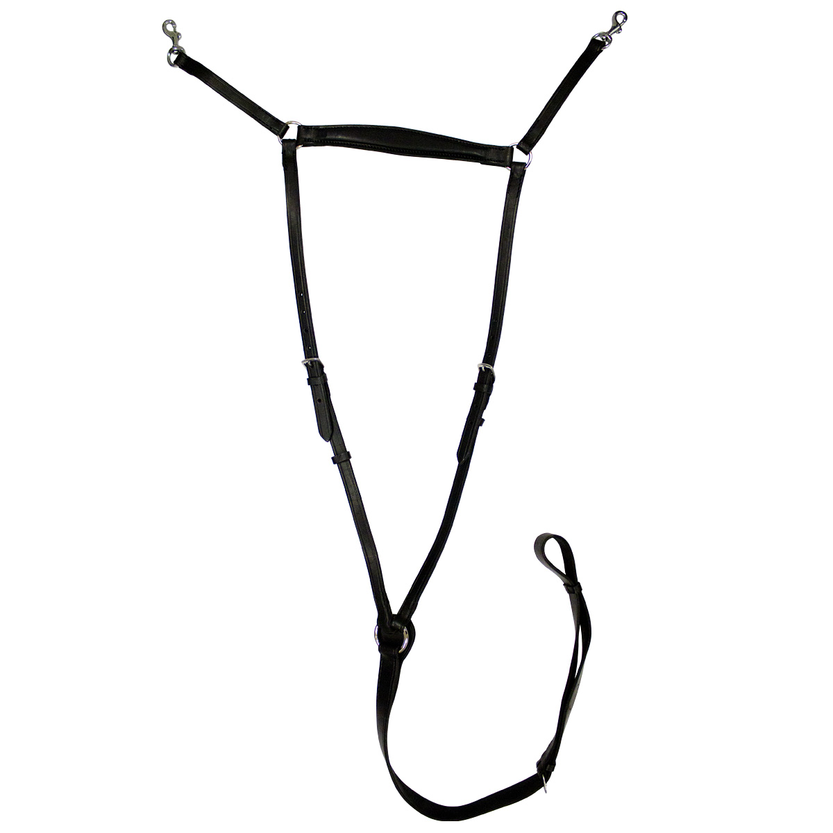 Нагрудник из натуральной кожи. Применяется при езде по пересеченной местности или в конкуре. Не дает седлу сползать назад. Ремешки для пристегивания к седлу на удобных карабинах.