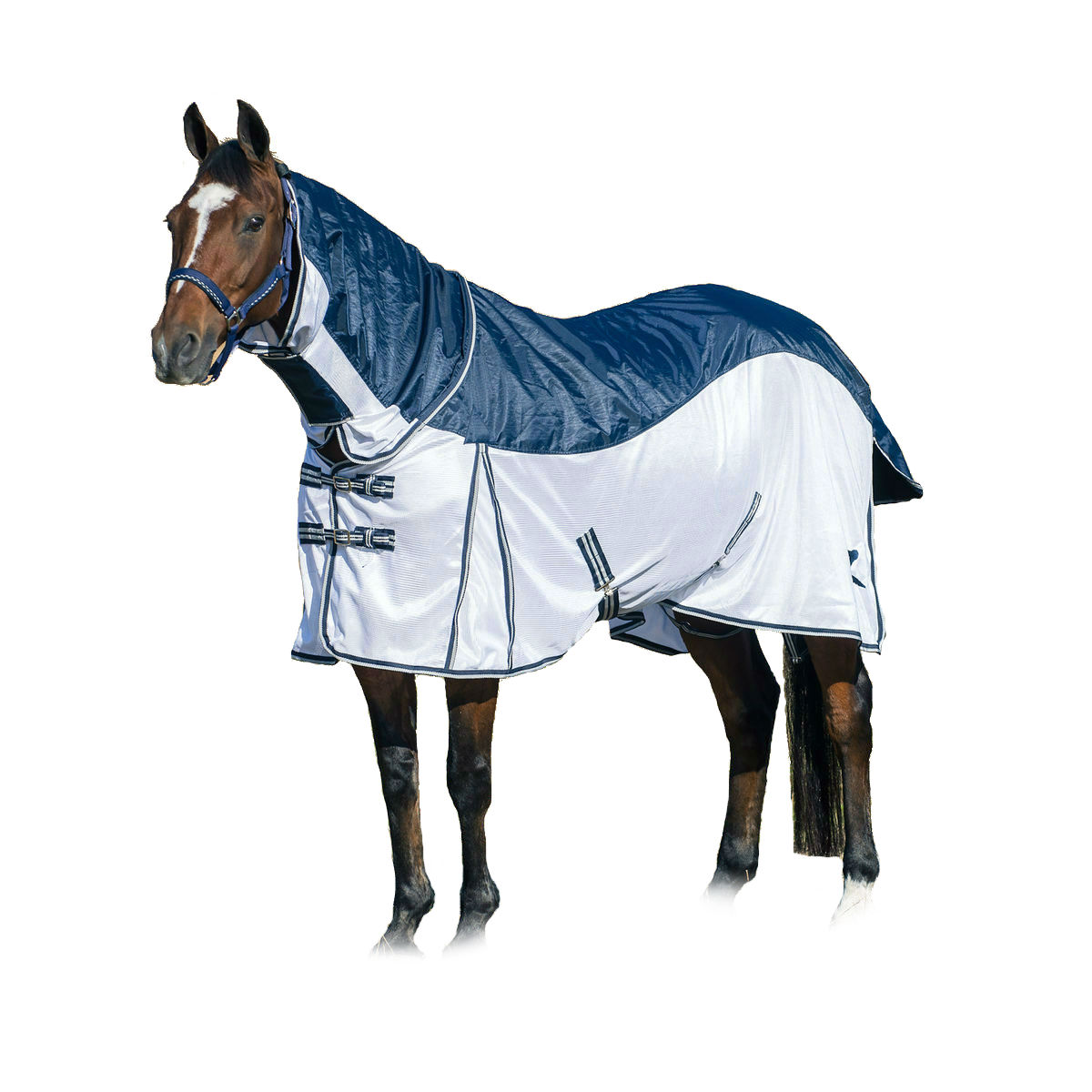 Функциональная противомоскитная попона (Anty-fly Rug) из дышащего прочного материала обеспечивает эффективную защиту лошади от насекомых. Попона сочетает в себе защиту от насекомых с водонепроницаемой тканью для защиты спины лошади от сильных летних дождей. Капор застегивается на липучке, съемные ремни для ног и плечевая вытачка.