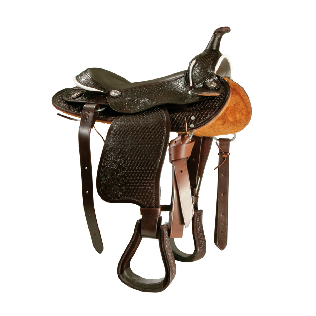 Сиденье и деревянный ленчик обтянуты гладкой кожей. Отделка полок снизу выполнена из искусственного меха, что предотвращает натирание в течение прогулок. В комплект входят традиционные кожаные приструги в комплекте с передней веревочной подпругой, стремена из дерева с кожаным покрытием, пристежка для подперсья. Седло украшено тиснением в виде цветочного рисунка и металлическими розетками в виде звезды. Изысканная металлическая фурнитура и тиснение на коже делают седло очень нарядным, что позволяет использовать седло не только для тренировок, прогулок и походов, но и для праздников и шоу!