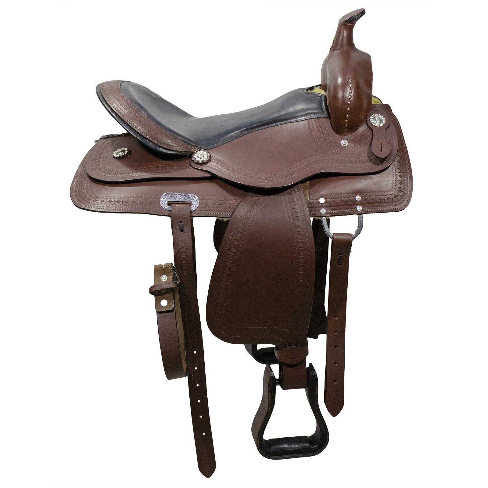 Седло Вестерн (Western Saddle) - прекрасный вариант для длительных прогулок. Его конструкция позволяет и всаднику, и лошади чувствовать себя комфортно в долгих поездках. Сиденье выполнено из натуральной кожи контрастного цвета. Отделка полок снизу выполнена из искусственного меха, что предотвращает натирание в течение прогулок. В комплект входят традиционные кожаные приструги и стремена с кожаным покрытием. Седло украшено металлическими розетками. Изысканная металлическая фурнитура и тиснение на коже делают седло очень нарядным, что позволяет использовать седло не только для тренировок, прогулок и походов, но и для праздников и шоу!