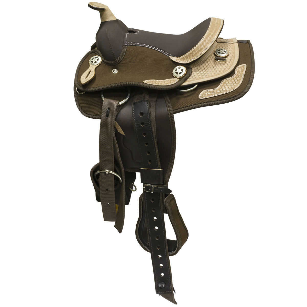 Синтетическое седло вестерн для пони (Western Pony Saddle). Седло декорировано кожаными вставками с тиснением. Сиденье выполнено из искусственной замши.
