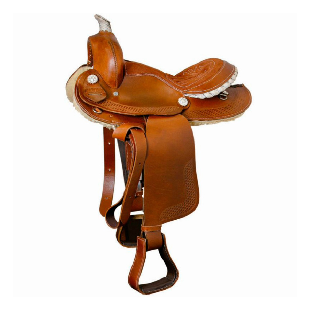 Кожаное седло для пони в стиле вестерн (Western Pony Saddle). Конструкция седла отличается высоко поднятым ленчиком, поэтому седло ляжет на любую холку. За счет ширины полок седла и расстояния между ними, седло будет безопасно как для лошади, так и для всадника. Также полки покрыты искусственным мехом, что предотвратит натирание спины лошади. Сиденье выполнено из замши. Седло украшено фирменной фурнитурой серебристого цвета.