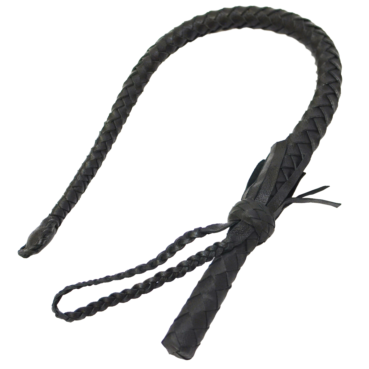Нагайка изготовлена из натуральной кожи путем восьмиосного плетения. Имеет плетеный поясок возле рукоятки. Плетеный темляк закреплен у основания рукоятки. Нагайка усилена - в сердцевине нагайки проходит стальной тросик (тросик толщиной 2-3 мм.), длина нагайки 84 см (погрешность - 2 см). Вес изделия около 250 грамм.