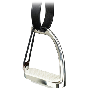 Классические безопасные стремена. Из нержавеющей стали. С внешней стороны снабжены застежкой на резинке. При падении всадника резинка на внешней дуге стремени отстегивается и нога выскакивает из стремени. В комплекте с резинками.