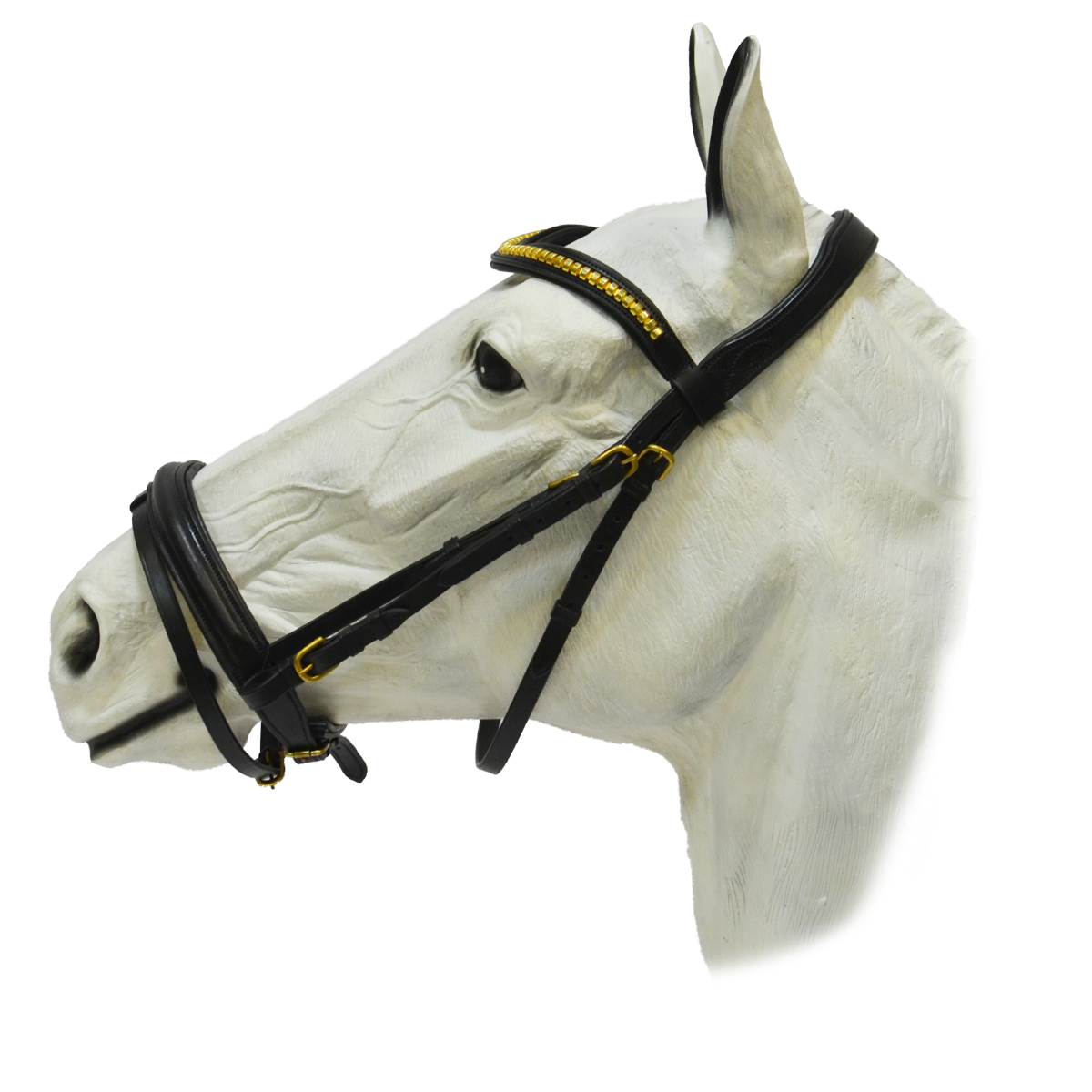 Оголовье из высококачественной натуральной кожи (Leather Bridle). Мягкие подложки на капсюле, налобном и затылочном ремне делает уздечку комфортной даже для чувствительных лошадей. В комплекте с уздечкой идет тесьмяный повод с ограничителями и нашивками против скольжения. Кожа высокого качества и крепкая фурнитура обеспечат долгую службу уздечки. На налобном ремне объемный металлический декор золотистого цвета. Трензель в комплект не входит.
