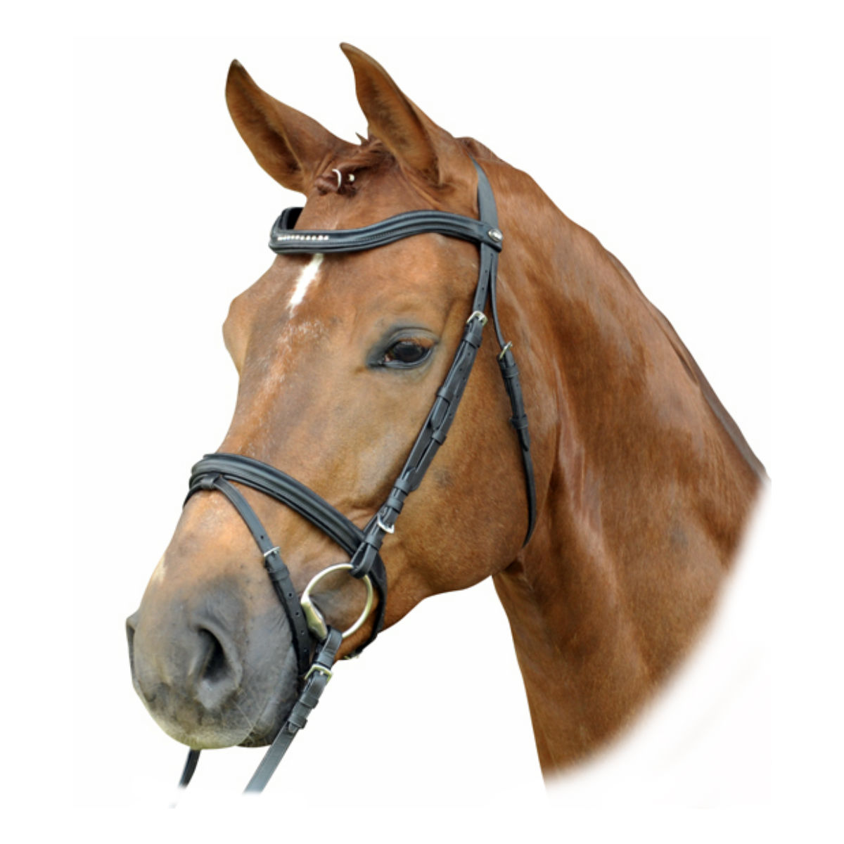 Трензельное головье из натуральной кожи (Leather Bridle). Налобник и капсюль на мягкой подложке, что обеспечивает максимальный комфорт вашей лошади. Налобный ремень украшен стразами. В комплект входит тесьмяный повод с ограничителями и нашивками против скольжения. Кожа высокого качества и крепкая фурнитура обеспечат долгую службу уздечки. Фурнитура серебристого цвета.