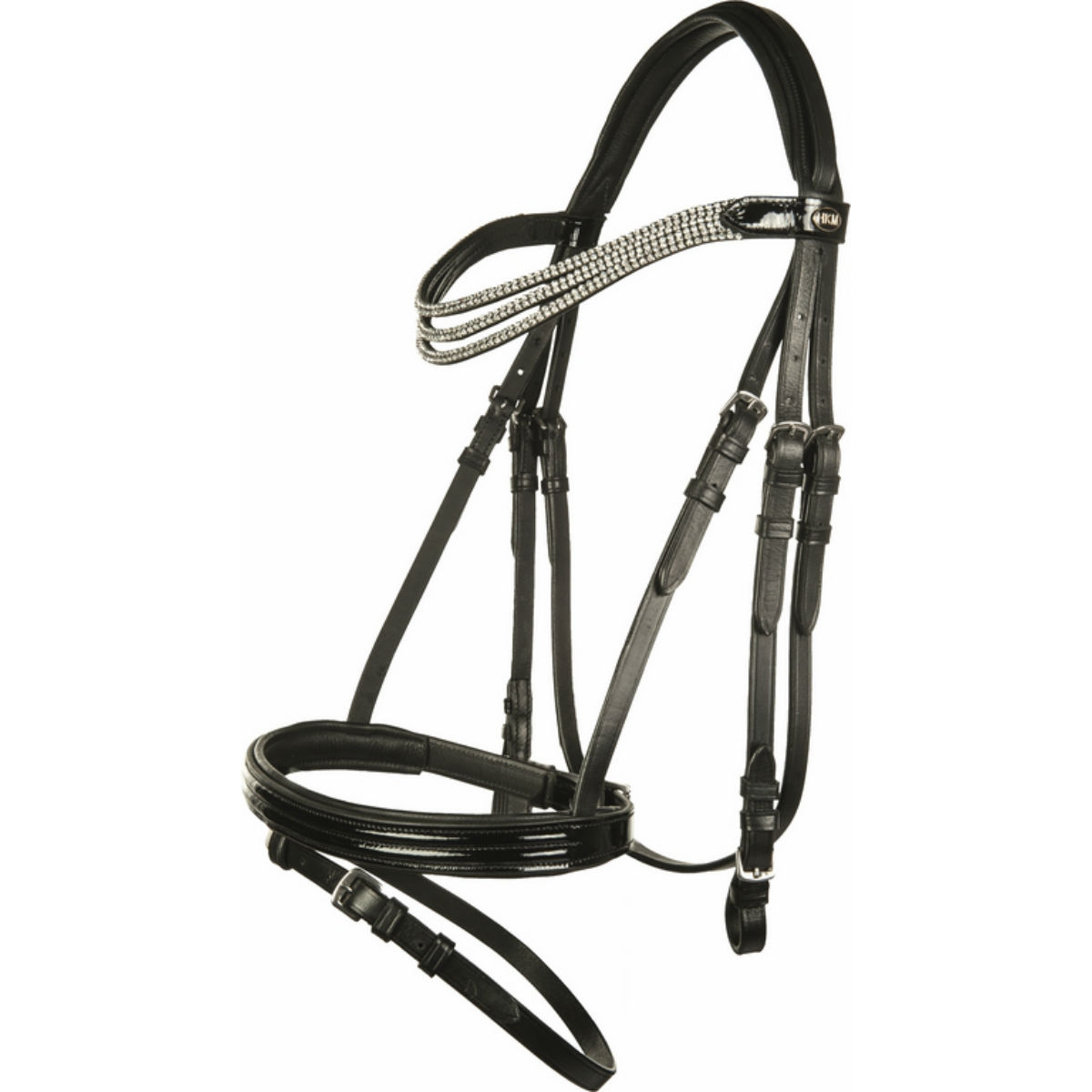 Элегантное трензельное оголовье из кожи высокого качества с английским капсюлем. Налобный ремень выполнен из страз. Капсюль из лаковой кожи с мягкой подложкой, что предотвращает натирание. Ремень капсюля проходит над затылочным ремнем. Фурнитура серебристого цвета. Повод тесьмяный с ограничителями в тон оголовья.