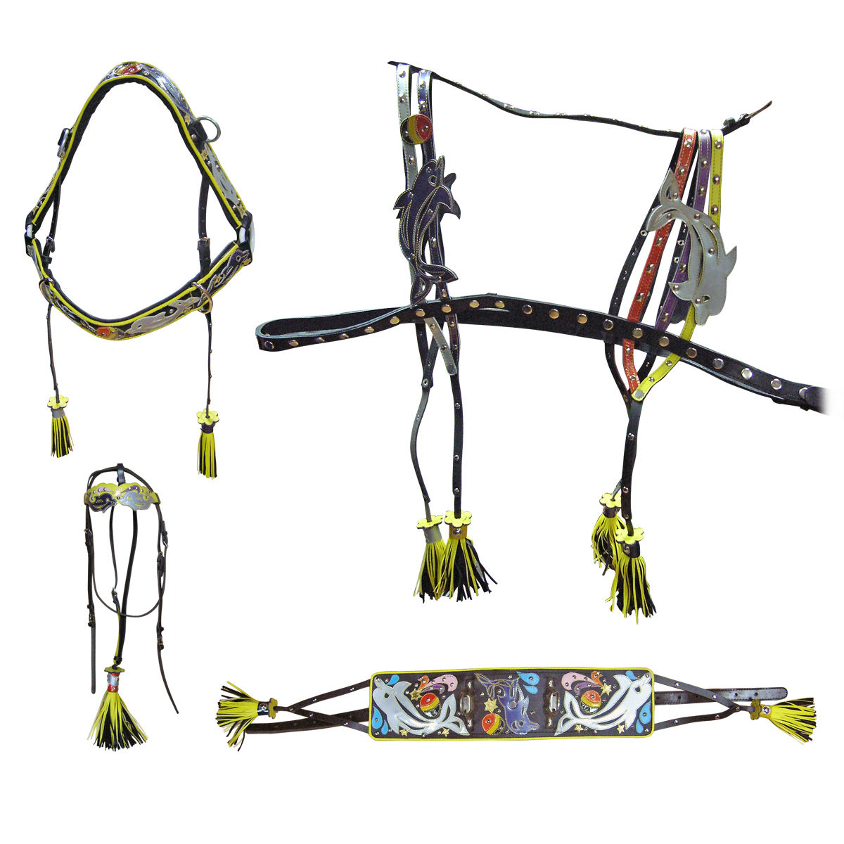 Упряжь парадная для пони с шоркой ( dress breastcollar harness). В комплект входит: уздечка с поводом, шлея, вожжи, шорка с постромками, седелка с подпругой, чересседельник. Упряжь украшена рисунком из цветной кожи.