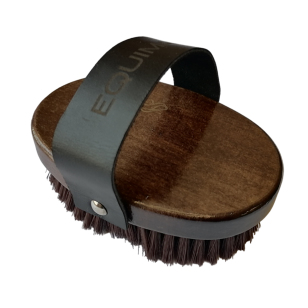 Щетка (brush) с искусственной щетиной средней жесткости на деревянной лакированной основе с кожаным ремешком для руки. Подходит для очистки тела после удаления основной грязи. Щетка украшена красивым принтом в виде лошади. На ремешке надпись EQUIMAN.
