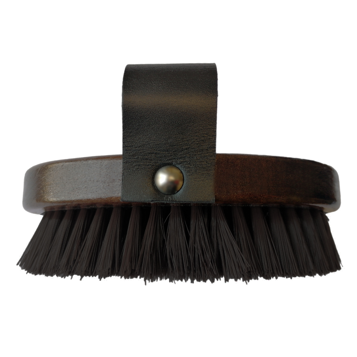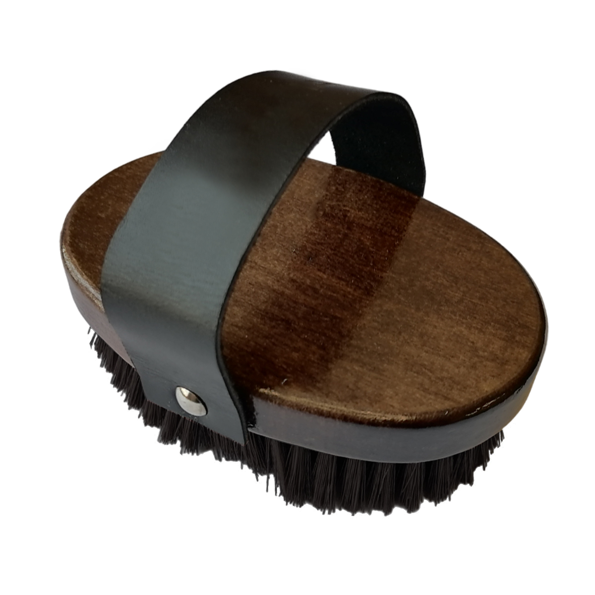 Щетка (brush) с искусственной щетиной средней жесткости на деревянной лакированной основе с кожаным ремешком для руки. Подходит для очистки тела после удаления основной грязи. Щетка украшена красивым принтом в виде лошади. На ремешке надпись EQUIMAN.