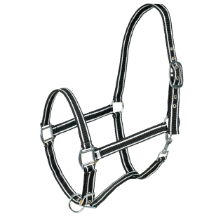 Недоуздок нейлоновый двухцветный. Легко регулируется под подбородком. Пряжки с латунным покрытием.