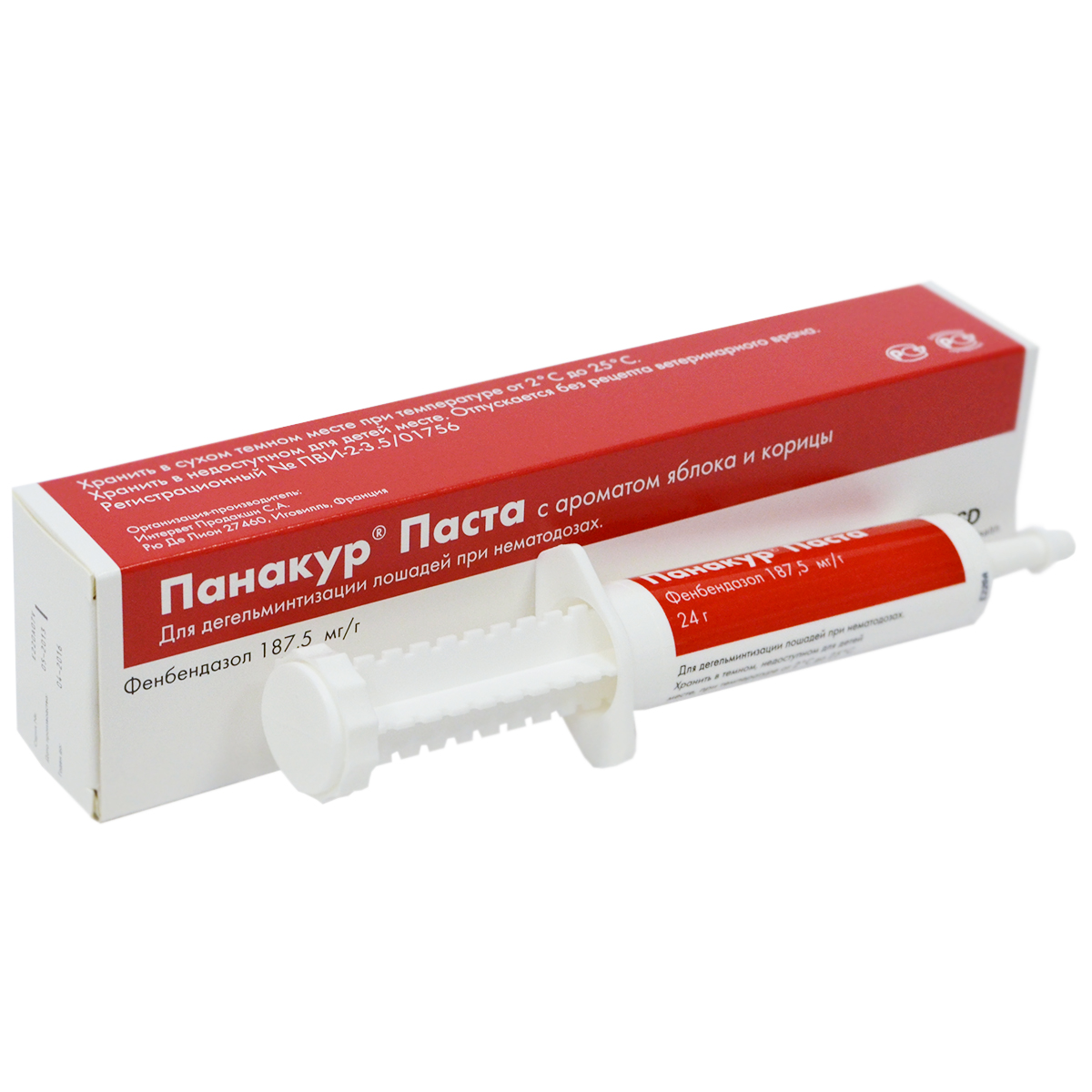 Пасту «Панакур» применяют для дегельмитизации лошадей при нематодозах. Входящий в состав препарат фенбендазол обладает широким спектром антигельминтного действия; активен в отношении взрослых форм, личинок и яиц нематод желудочно-кишечного тракта и легких, паразитирующих у животных. Механизм действия препарата заключается в нарушении энергетических процессов, ингибиция полимеризации тубулина микроканальцев в клетках кишечника гельминтов, что приводит к гибели паразита.