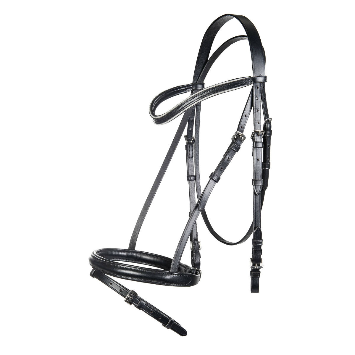 Оголовье трензельное из качественной натуральной кожи (Leather Bridle). Налобник по краям украшен вставкой с блестящим напылением золотистого цвета (для оголовья коричневого цвета) или вставка серебристого цвета (для оголовья черного цвета). Мягкая подложка на капсюле и налобнике. В комплект входит тесьмяный повод с ограничителями и нашивками против скольжения. Фурнитура серебристого цвета.