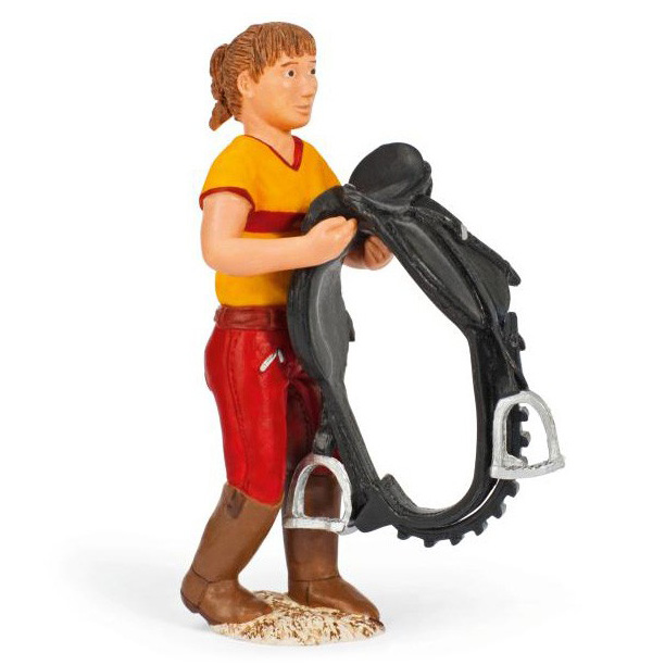 Наездница в форме жокея держит в руках кожаное седло. Может, она уже сняла его с лошади, чтобы она отдохнула после продолжительной тренировки, а может быть только готовит его для того, что бы ее снарядить. Фигурки изготовлены из гибкого мягкого пластика. Каждая фигурка серии раскрашена в ручную, что придаёт ей особую ценность, ведь таким образом каждый персонаж становиться по-настоящему уникальным. Игрушка не предназначена для детей младше трех лет, так как может содержать мелкие детали.