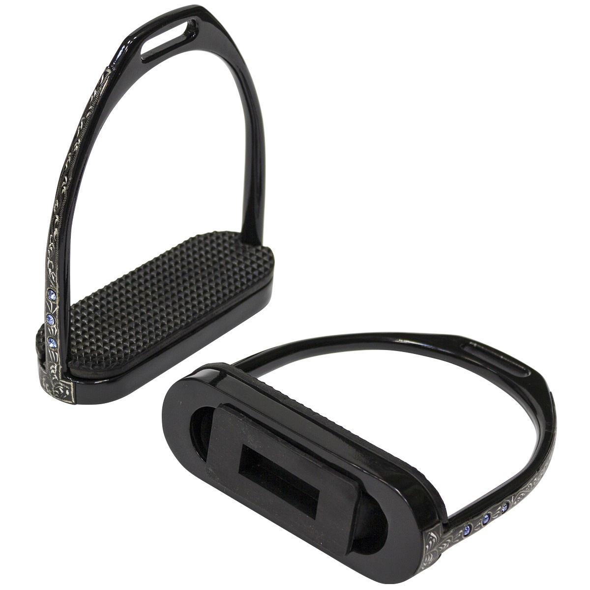 Стремена из нержавеющей стали. Украшены красивым узором и стразами. Нанесено черное напыление. В комплект входят резинки черного цвета. Размер площадки 12 см.