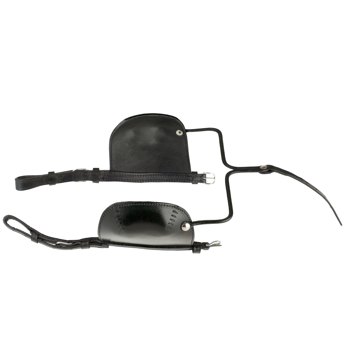 Закрытые блиндера (closed blinders) из высококачественной натуральной кожи. Наглазники имеют необычную, но при этом удобную, квадратную форму с округлыми углами и некоторой выпуклостью наружу. Форма позволяет деталям повторять каждое движение головой. При этом блиндера, полностью ограничивая заднее и боковое зрение, не доставляют ей неудобства, т.к. повторяют анатомическую форму глаза. Фурнитура сделана из нержавеющей стали.