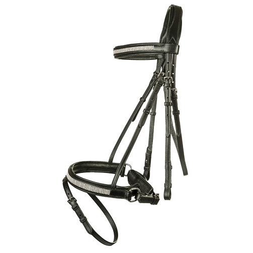 Оголовье трензельное из качественной натуральной кожи. Налобный ремень и капсюль украшены стразами. Мягкая подложка на капсюле, затылочном и налобном ремнях делает уздечку комфортной даже для чувствительных лошадей. Все пряжки сделаны из нержавеющей стали. В комплект входит тесьмяный повод с ограничителями. Фурнитура серебристого цвета. Трензель в комплект не входит.