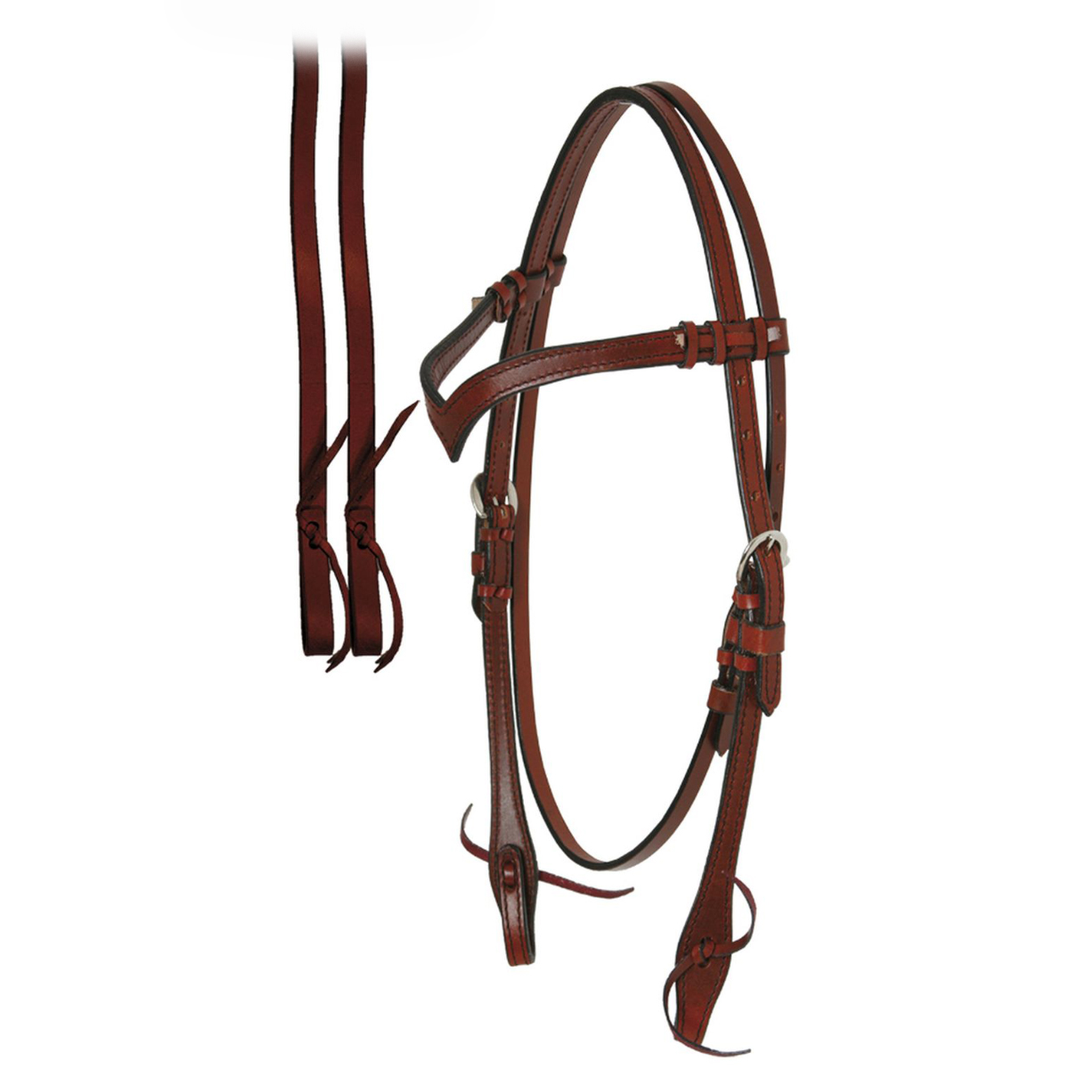 Оголовье вестерн из кожи высокого качества. Налобный ремень V-образной формы, в комплект входит кожаный повод. С регулируемым щечным ремнем с двух сторон. Фурнитура серебристого цвета из нержавеющей стали. Трензель в комплект не входит.