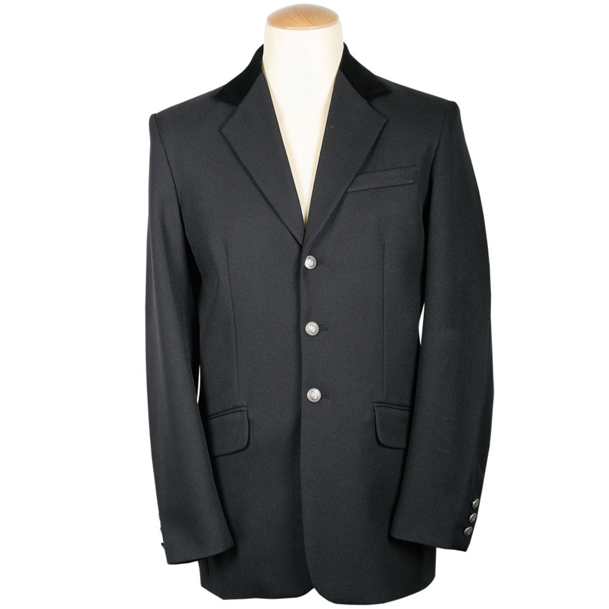 Элегантный редингот с бархатным воротником. Спереди на трех пуговицах. С двумя боковыми и нагрудным карманами, сзади шлица. Пуговицы серебристого цвета с изображением головы лошади.