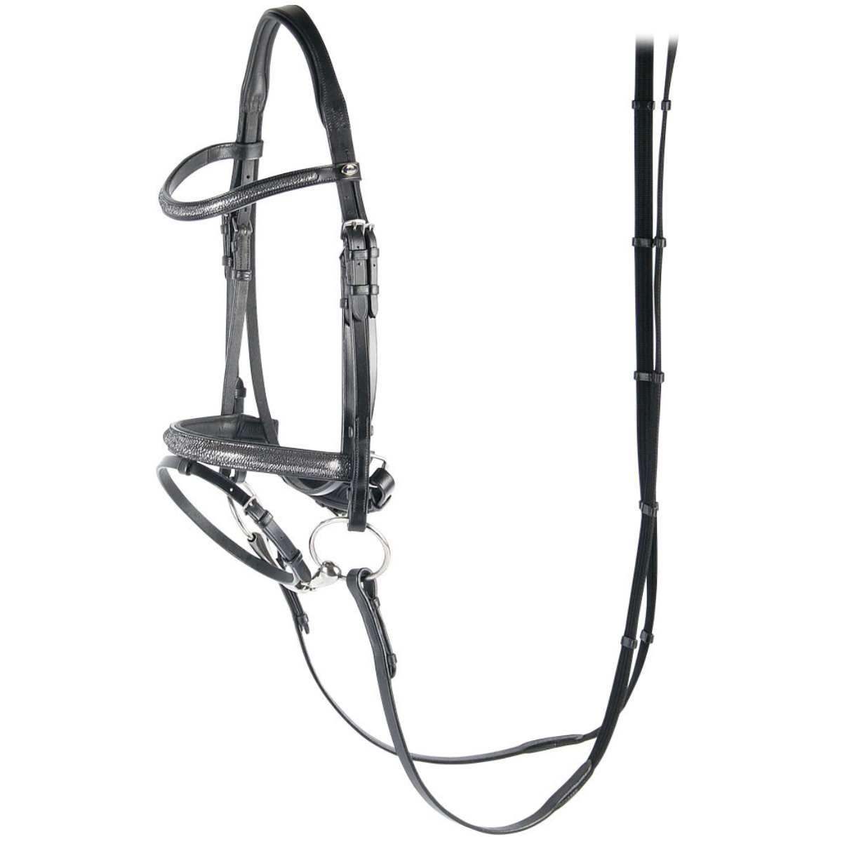 Мягкое кожаное оголовье с самозатягивающимся капсюлем. На налобном ремне и капсюле декоративные вставки из блестящей кожи. Мягкая подложка на затылочном ремне и капсюле. В комплект входит тесьмяный повод с ограничителями. Трензель в комплект не входит.
