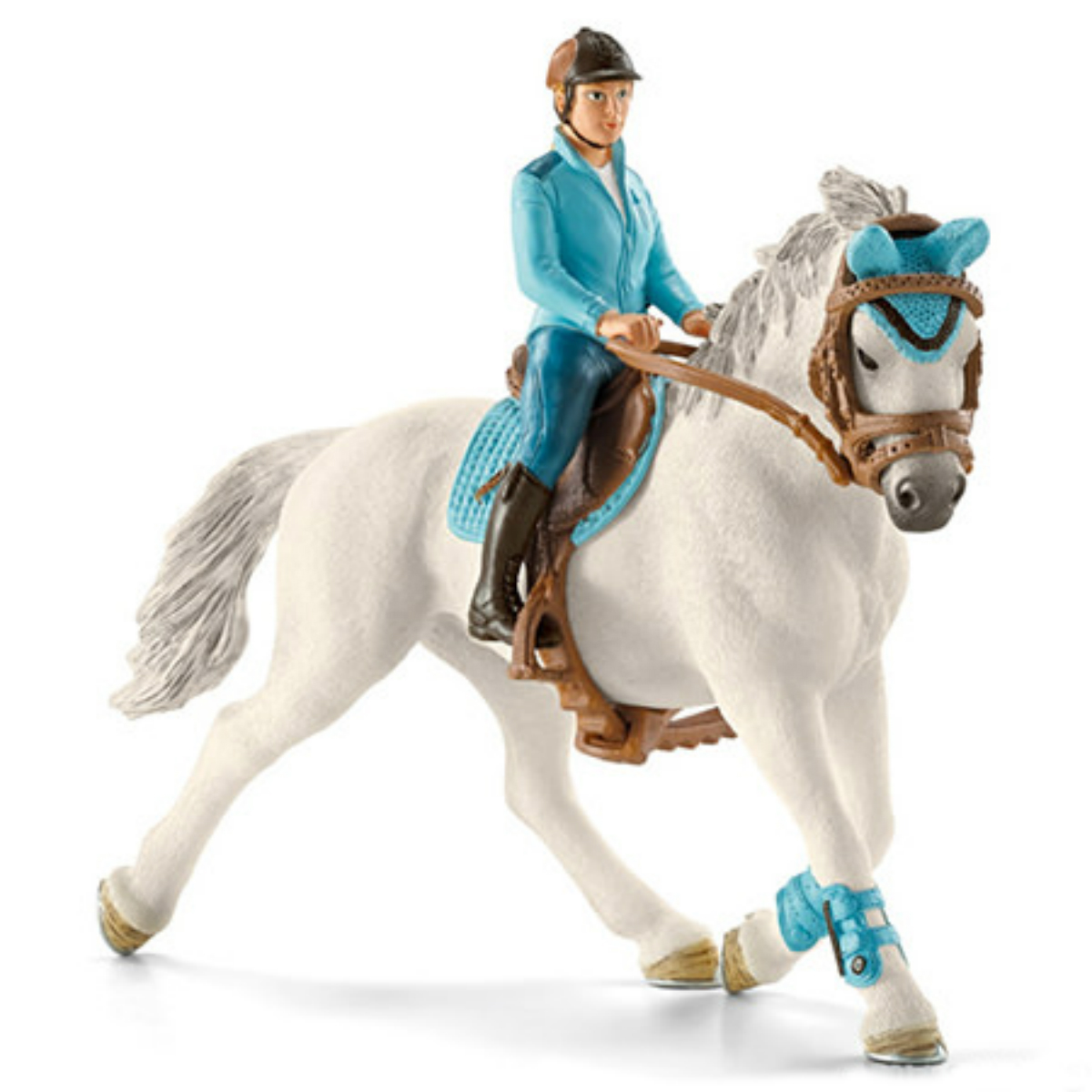 В наборе представлена лошадь и всадник, который уверенно сидит в седле, держась за поводья. На всаднике спортивная форма синего цвета, которая гармонирует с экипировкой лошади. Всадник и набор для верховой езды снимается, что позволяет использовать игрушки отдельно или комбинировать с другими лошадками Шляйх.
