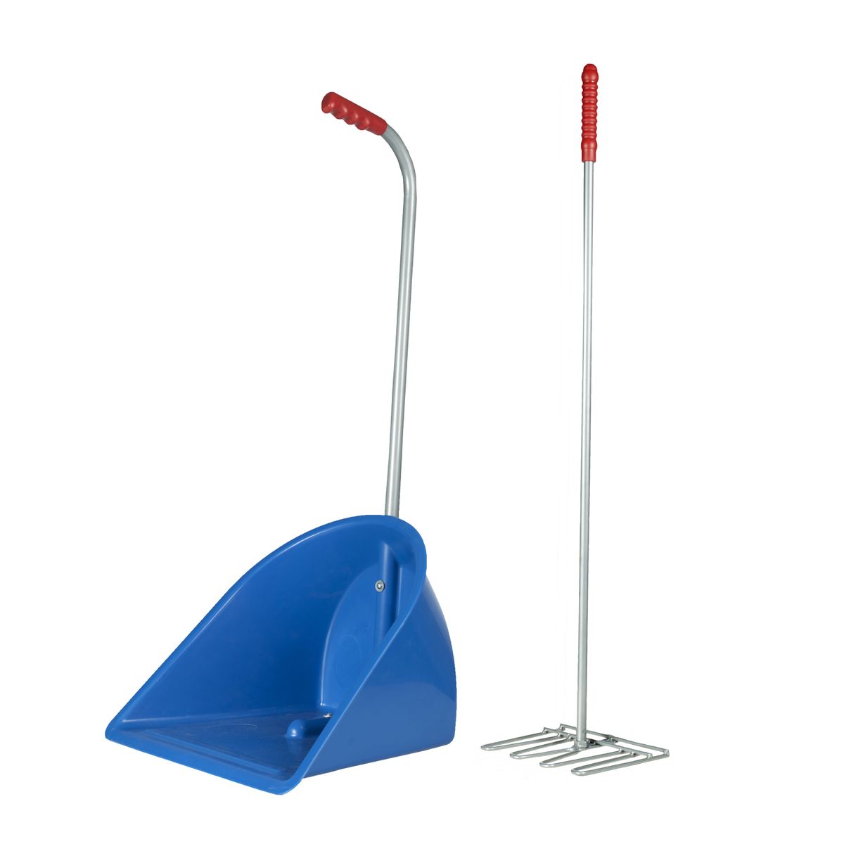 Легкий совок с длинной ручкой и грабли для уборки в конюшне или на плацу.