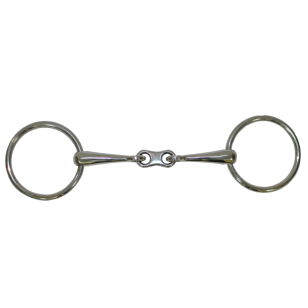 Трензель "восьмерка" с плоской серединой (Double Jointed Loose Ring Snaffle) сделан из гладкой полированной нержавеющей стали. Трензель с плоской "восьмеркой" , которая делает его чуть строже, позволяет добиться от лошади большего послушания, но в то же время он не будет раздражать ее или травмировать.