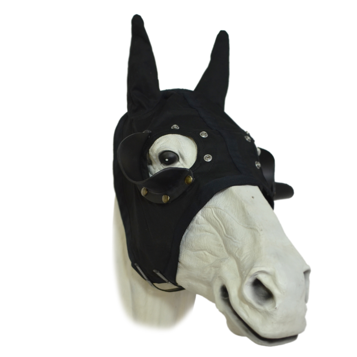 Маска изготовлена из прочного материала с закрытыми ушами. Маска идет в комплекте с пластиковыми полузакрытыми наглазниками, которые крепятся на кнопки. Имеет две застежки на подбородке.