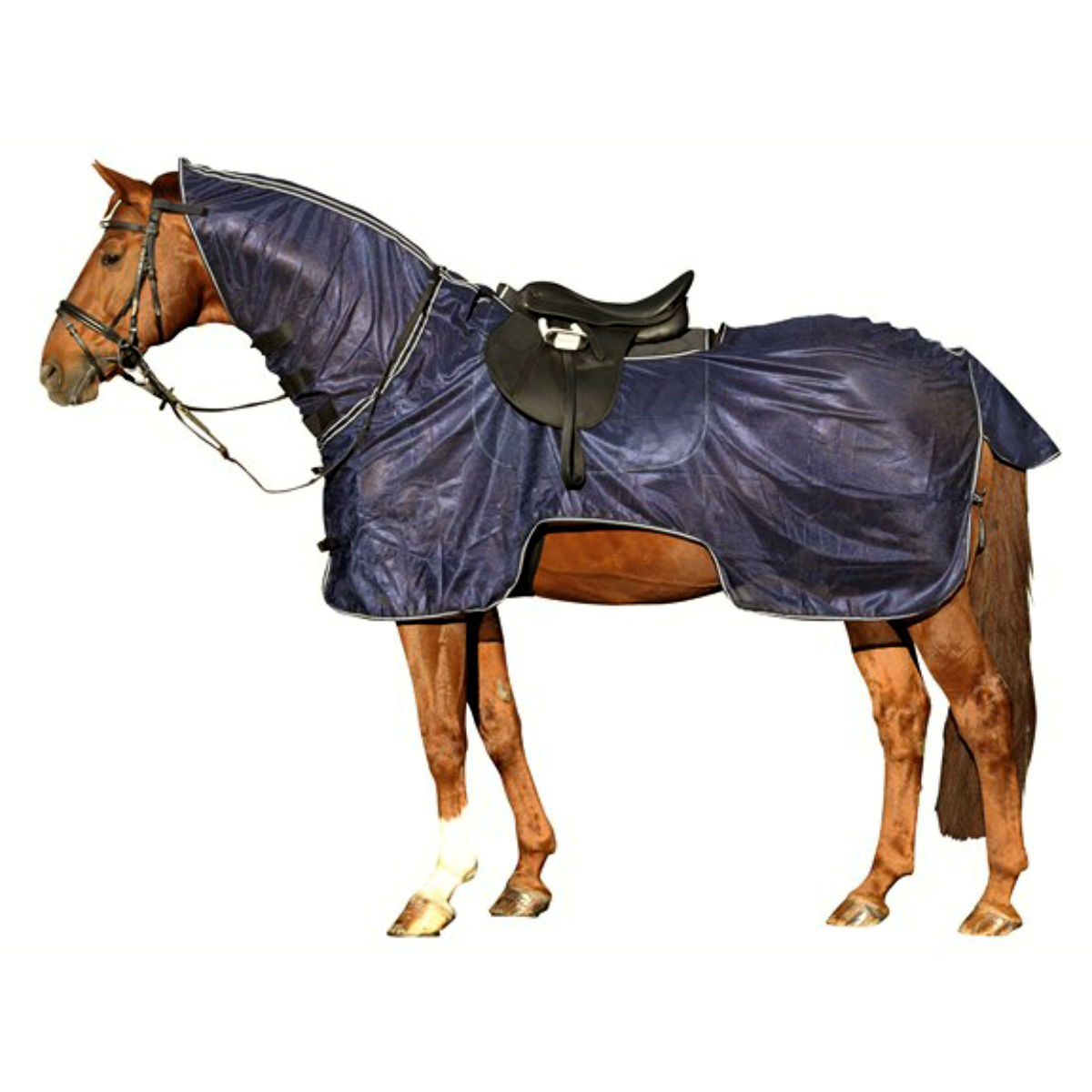 Летняя противомоскитная попона (Anti-Fly Rug) из высококачественного трикотажа обеспечивает эффективную защиту лошади от насекомых. Попона отлично защищает туловище животного, шею и хвост. Попона застегивается на ремешки с пряжками, на шее попона регулируется липучками. Имеется отверстие под седло. Материал попоны легок в уходе.