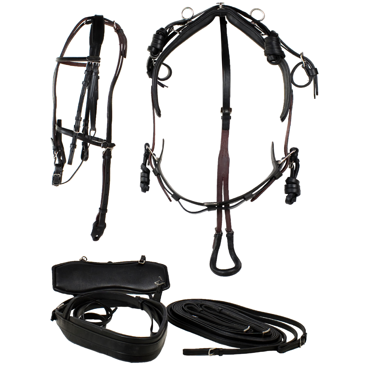 В коплект входит: - кожаная седелка с сережками на упряжь и рабочими ремнями, - подкладка под седелку, - кожаная подпруга, - кожаная пахва с петлей для хвоста, - кожаный нагрудник, - вожжи, - кожаная уздечка с оверчеком и подбородным ремнем.